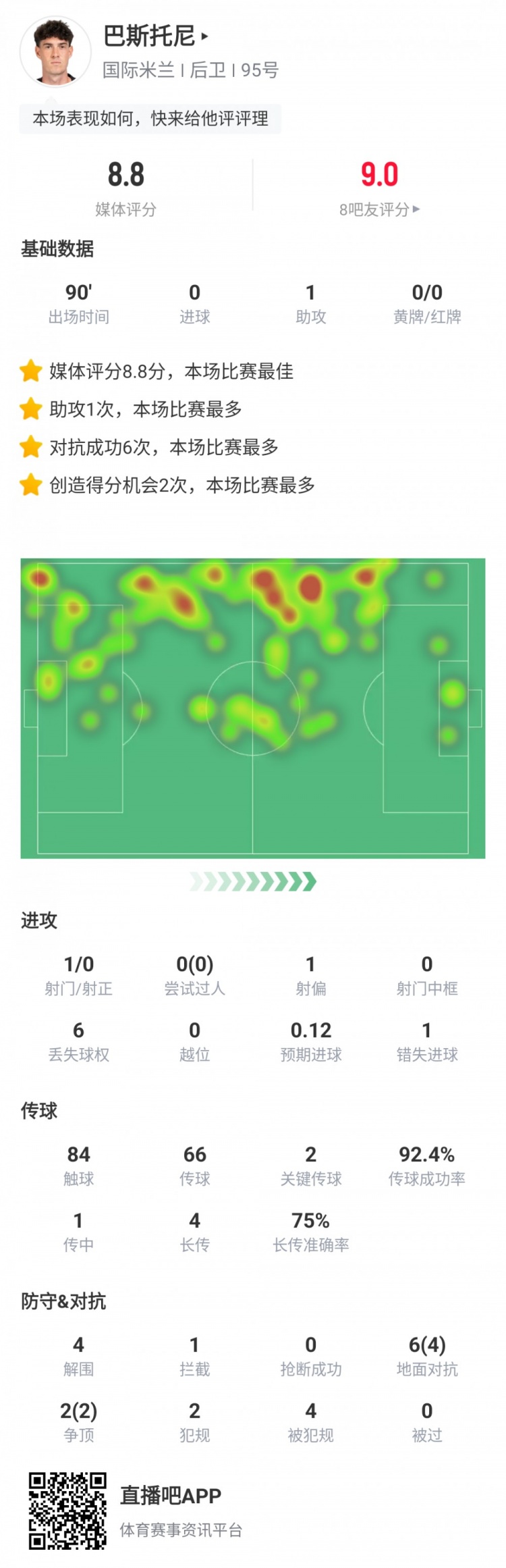 điểm truyền thông điểm 8,8 điểm, cao nhất trong trò chơi, 1 hỗ trợ, 6 lần đối đầu thành công, hầu hết các cơ hội ghi điểm trong trò chơi này, hầu hết các cú đánh Vượt qua dài, vượt qua 75%