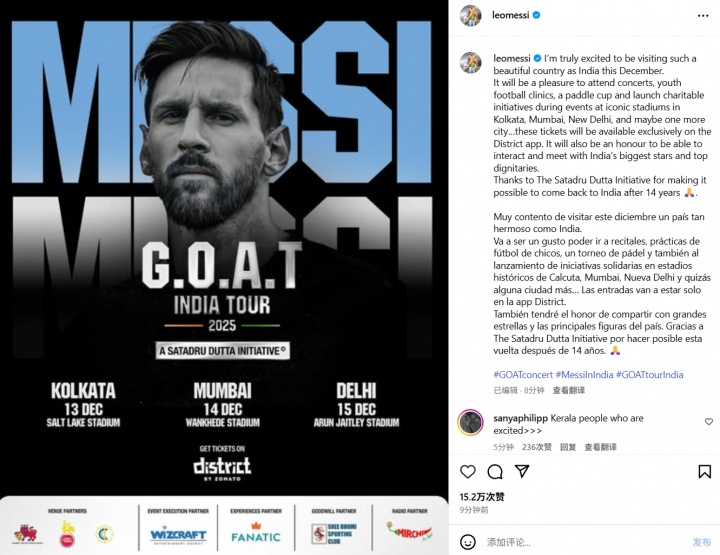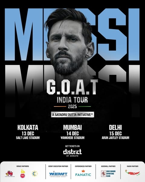 Messi đã phát hành một phương tiện truyền thông xã hội, chính thức thông báo rằng ông sẽ bắt đầu chuyến lưu diễn của mình tại Ấn Độ vào tháng 12 năm nay, tham gia vào một số hoạt động và tương tác với những người nổi tiếng và các nhà lãnh đạo chính trị cao cấp.