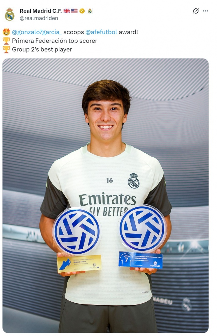 Gonzalo Garcia là vua phá lưới ở La Liga mùa trước và được bầu là cầu thủ xuất sắc nhất bảng B La Liga mùa trước. Mạng xã hội chính thức của Real Madrid đăng tải bức ảnh Gonzalo Garcia nhận giải để chúc mừng anh.