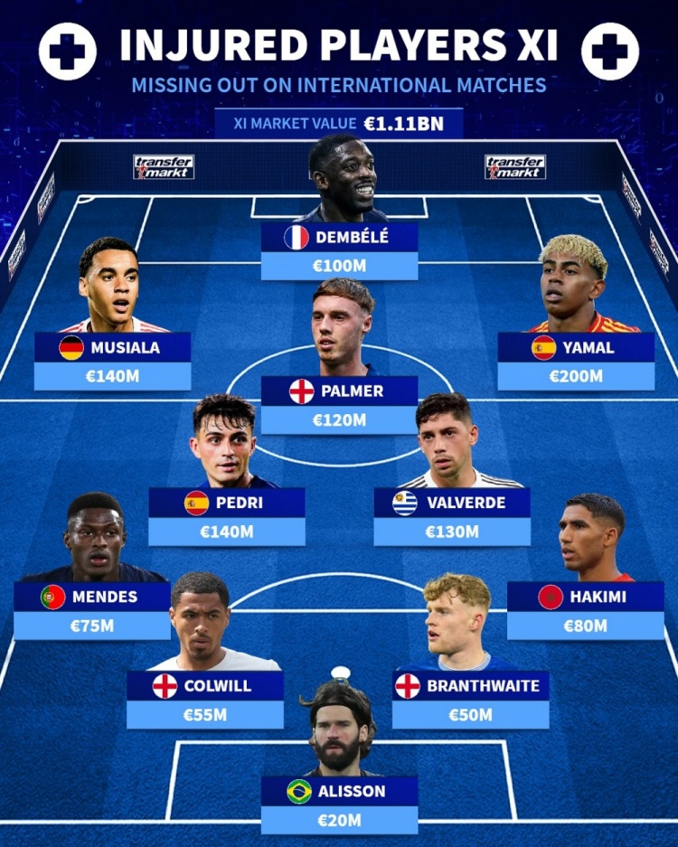 Vào ngày thi đấu quốc tế này, nhiều ngôi sao đã không thể đại diện cho đội tuyển quốc gia do chấn thương, trong đó có tân cầu thủ đoạt Quả cầu vàng Dembele, hai tướng Yamal và Pedri của Barcelona cùng những người khác. Thị trường chuyển nhượng Đức đã chốt lại đội hình giá trị nhất của những cầu thủ vắng mặt ở đội tuyển quốc gia hiện tại vì chấn thương. Dembele, Musiala, Yamal, Pedri và Palmer có tên trong danh sách. Tổng giá trị của dòng sản phẩm này lên tới 1,11 tỷ euro.