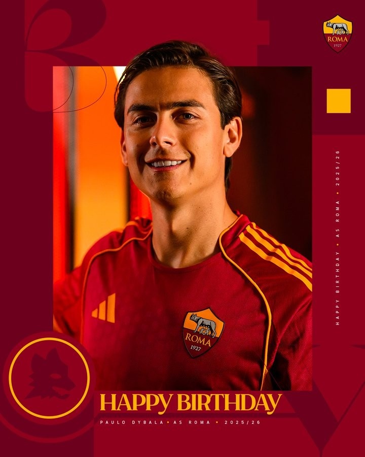 Hôm nay là sinh nhật lần thứ 32 của Paulo Dybala. Twitter chính thức của CLB Roma đã gửi lời chúc phúc tới anh.